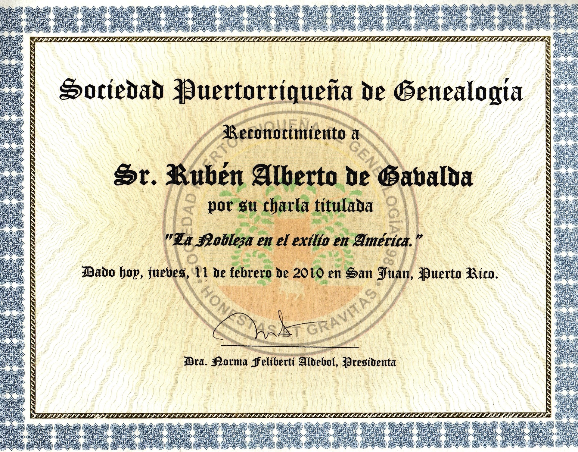 La Sociedad Puertorriqueña de Genealogía entregó un Diploma de reconocimiento a don Rubén Alberto de Gavaldá, por su disertación sobre la Nobleza exiliada en América, pronunciada en su sede de la Ciudad de San Juan de Puerto Rico, el 11 de febrero de 2010 / https://genealogiapr.com/